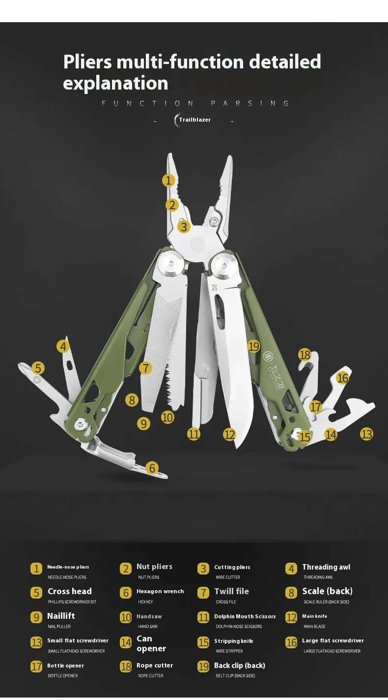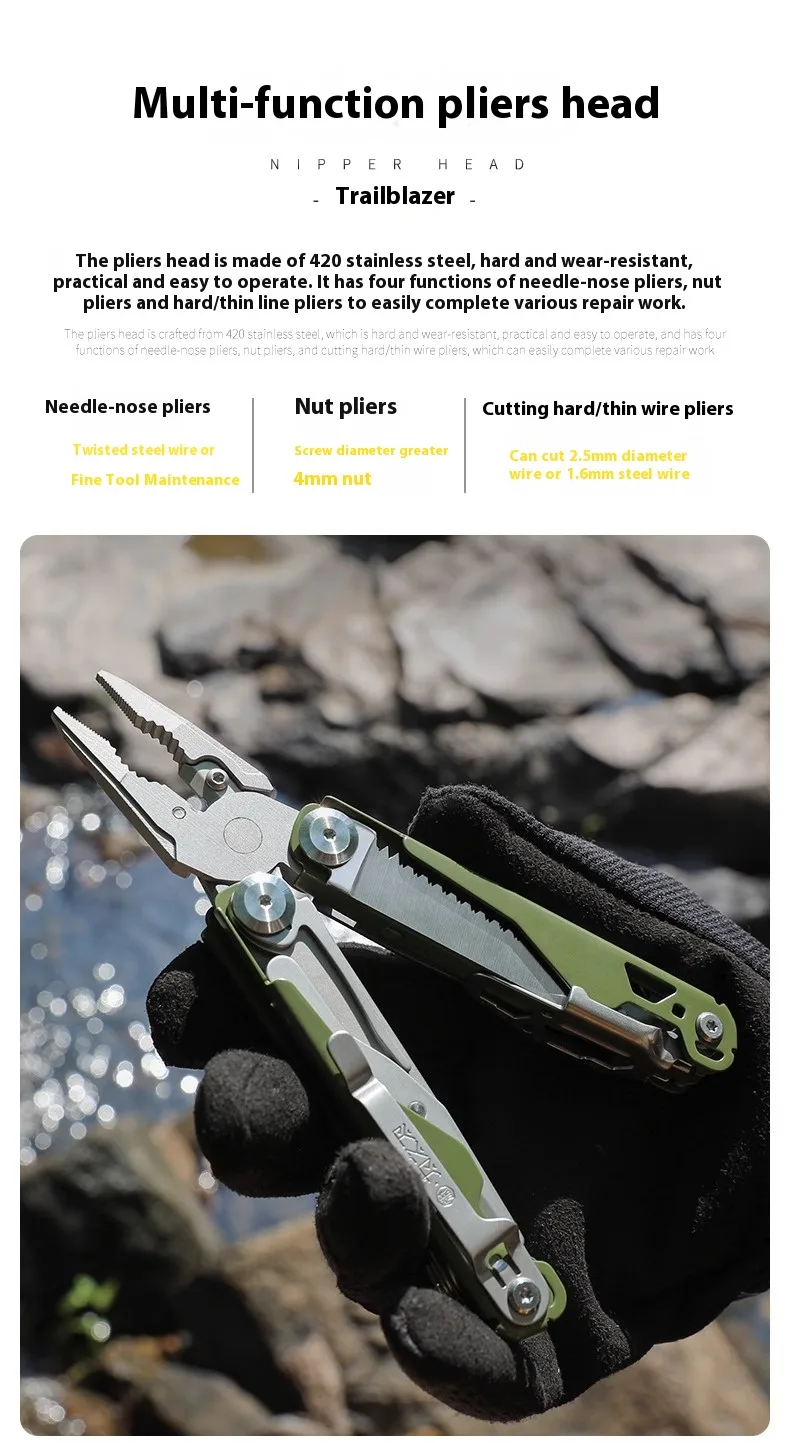 The WETACTICSPioneer 3.0 is the ultimate multi-tool pliers, combining 18 functions: needle-nose pliers, Phillips screwdriver, D2 steel blade, bottle opener, saw, and more. Crafted with premium D2 tool steel, compact and portable, ideal for camping, outdoor survival, and everyday carry (EDC). Free worldwide shipping.